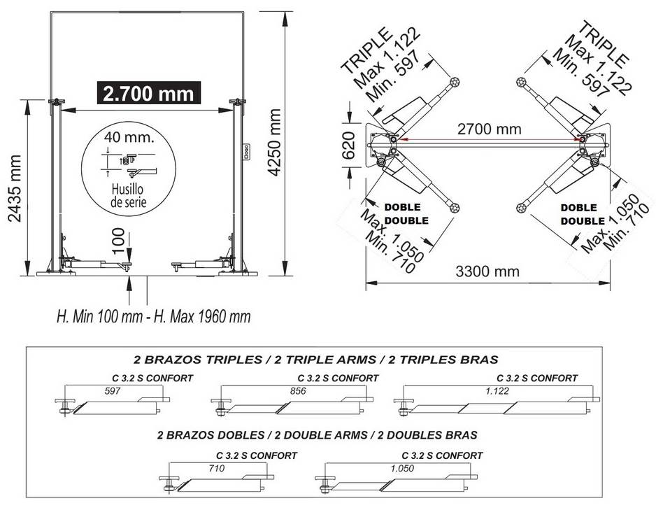 Mit den doppelt oder dreifach ausziehbaren Armen können Sie sowohl symmetrische als auch asymmetrische Arbeiten durchführen. Die Arme lassen sich schnell an den Aufnahmepunkten positionieren und das Fahrzeug perfekt zentrieren. So können diese in jedem Winkel und bei jeder Länge der maximalen Belastung standhalten.