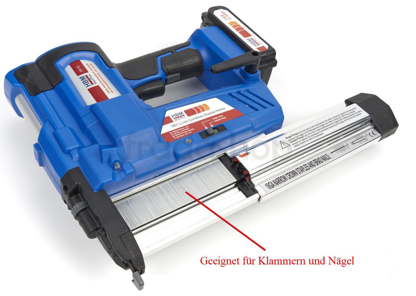 Diese Nagelpistole hat jedoch eine eigene Stromquelle eingebaut, es handelt sich um einen draht- und schlauchlosen Akku Tacker, der leicht zu transportieren ist.