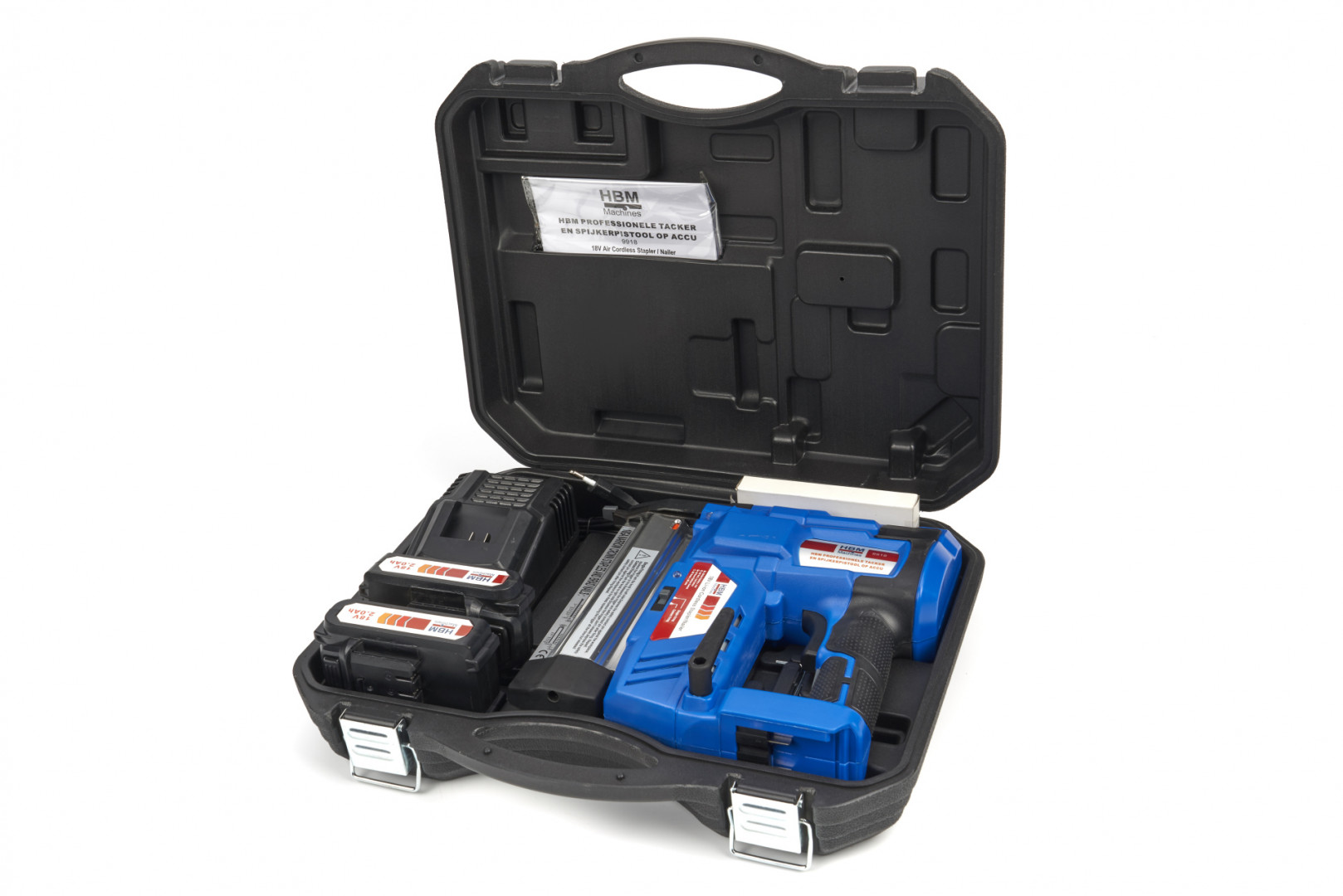 Der Tacker, zwei Akkus, ein Ladegerät und ein kleiner Vorrat an Nägeln werden in einem kleinen handlichen Koffer mitgeliefert.