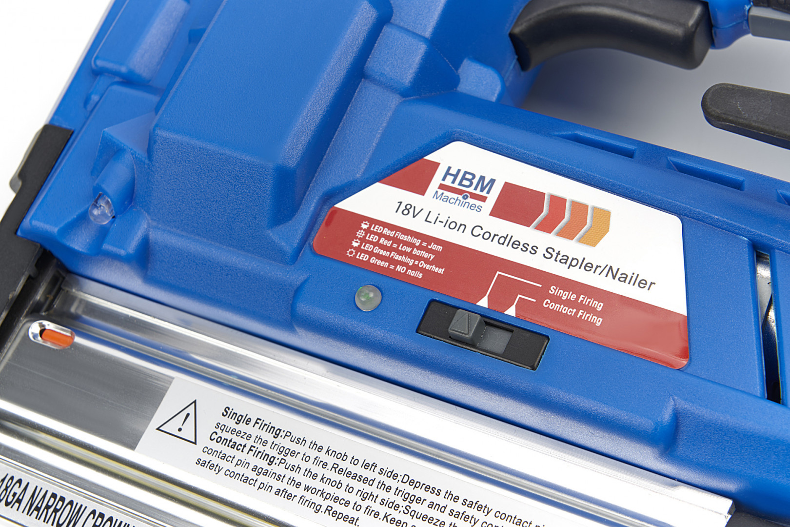 Zwei Power-LEDs auf beiden Seiten dieses Tackers beleuchten den Bereich, in den der Nagel eingeführt wird.