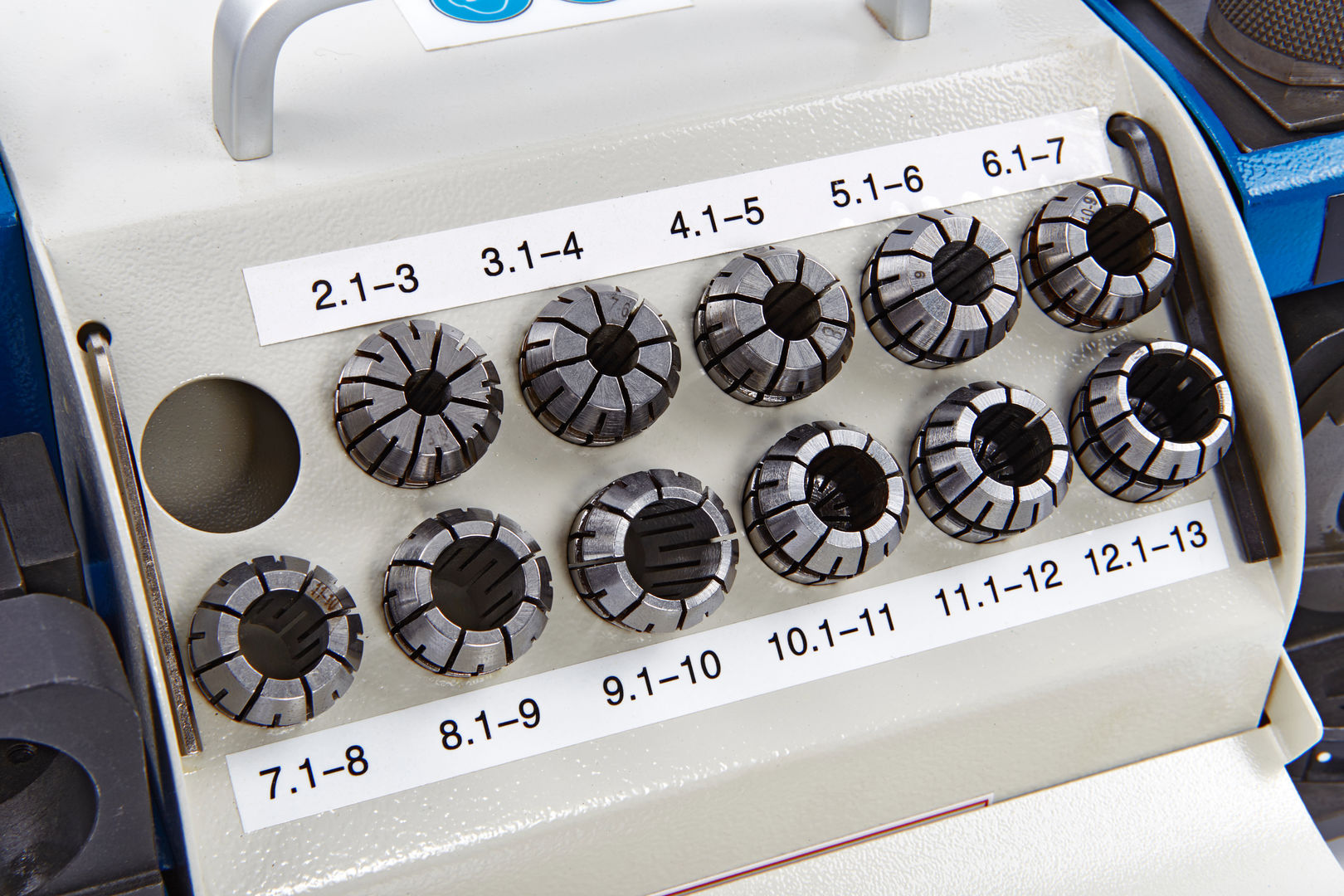 - Es gibt elf Spannzangen auf diesem Bohrerschleifer mit einem Spannbereich von 2 bis 13 mm