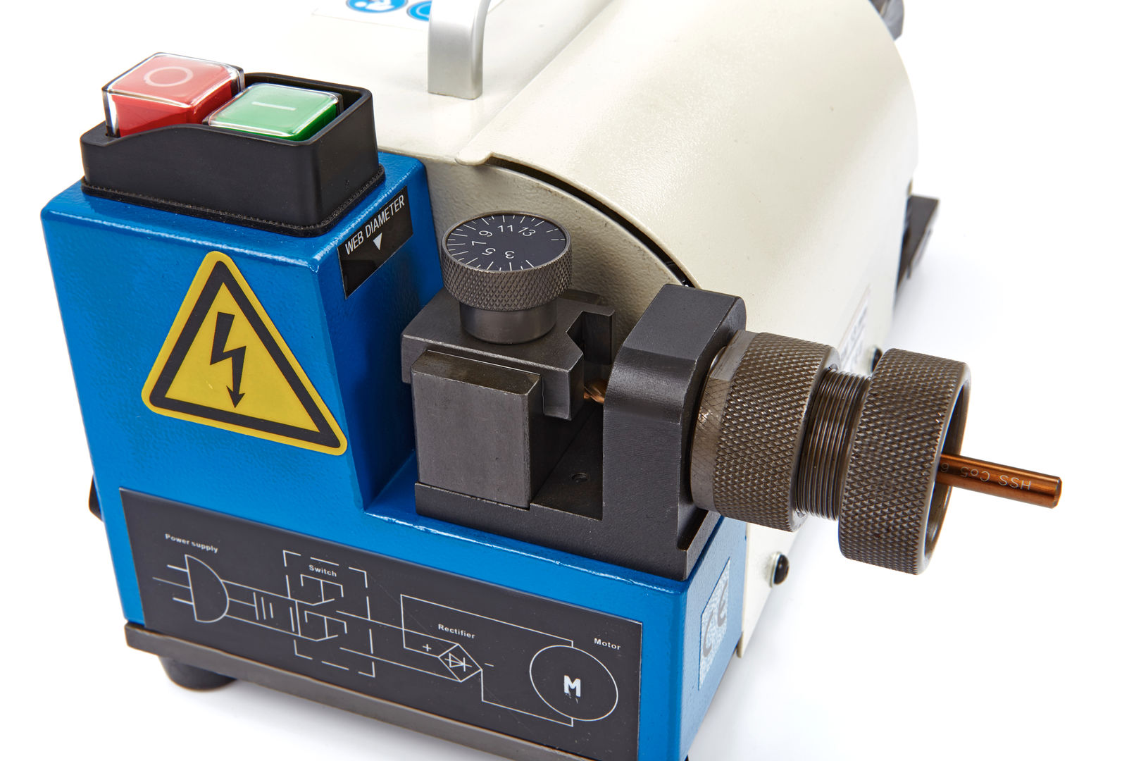 Dieser Bohrerschleifer ist ein einfach zu bedienendes Gerät. Sie können damit Bohrer mit einem Durchmesser von 2 bis 13 Millimetern schleifen. Der Bohrerschleifer verfügt über elf Spannzangen zum Schleifen von Spiralbohrern sowie über eine Vorrichtung zum Anreißen der Bohrer. Es handelt sich auch um ein Deluxe-Modell mit einer zusätzlichen Schleifeinrichtung. Diese befindet sich auf der Oberseite der Maschine.