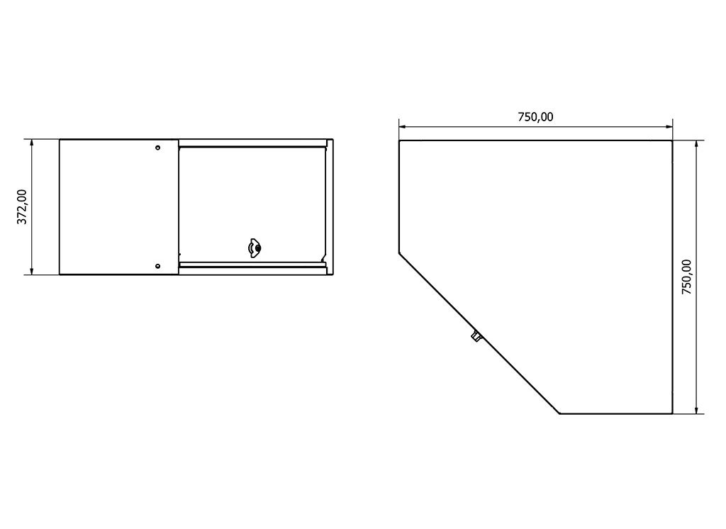 Dieser Eck-Wandschrank besteht aus einer Tür, die mit einem Zylinderschloss geschlossen werden kann, im Inneren befindet sich Stauraum.