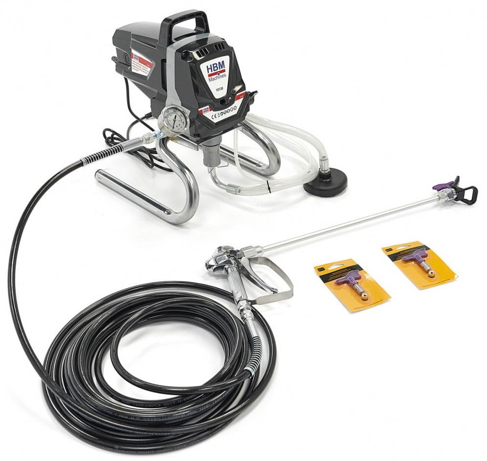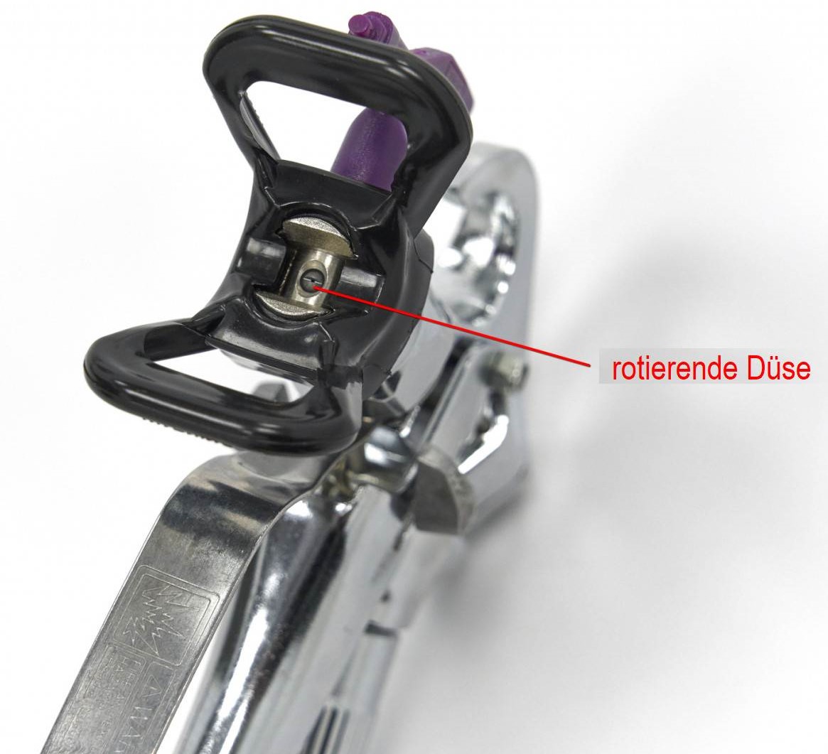 Dieses Sprühgerät ist nur für spezielle sprühbare Wandfarbe (kein Latex!), Beize und Lacke auf Wasser- und Lösungsmittelbasis geeignet. Die Farbe wird durch einen Silikon-Zulaufschlauch und der am Ende angebrachten großen und beschwerten Saugdüse aus dem Farbtopf oder Farbeimer angesogen. Durch den Filter in der Saugdüse werden harte Lackteile oder Farbpartikel nicht aufgenommen. Der Anschluss des Zulaufschlauchs an der Pumpe ist um 360° drehbar, so dass Sie frei wählen können, wo Sie den Farbbehälter platzieren. Das Farbspritzgerät pumpt die Wandfarbe unter sehr hohem Druck durch einen 10 Meter langen Schlauch zur Spritzpistole. Am Ausgang der Pumpe befindet sich ein Manometer, mit dem Sie den aktuellen Spritzdruck schnell ablesen können. Die Düse an der Spritzpistole ist drehbar, sodass sie sowohl horizontal als auch vertikal verwendet werden kann. Es können verschiedene Düsen mit unterschiedlichen Spritzbreiten eingesetzt werden. Der Lieferung liegen weitere Düsen bei. Außerdem liegt der Bestellung eine Verlängerung der Spritzpistole bei, die den Abstand zwischen Düse und Pistolengriff auf ca. 40 cm vergrößert.