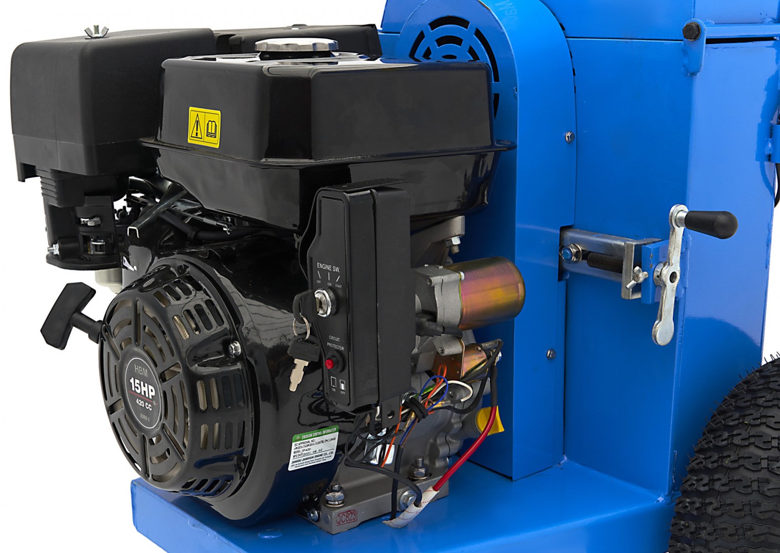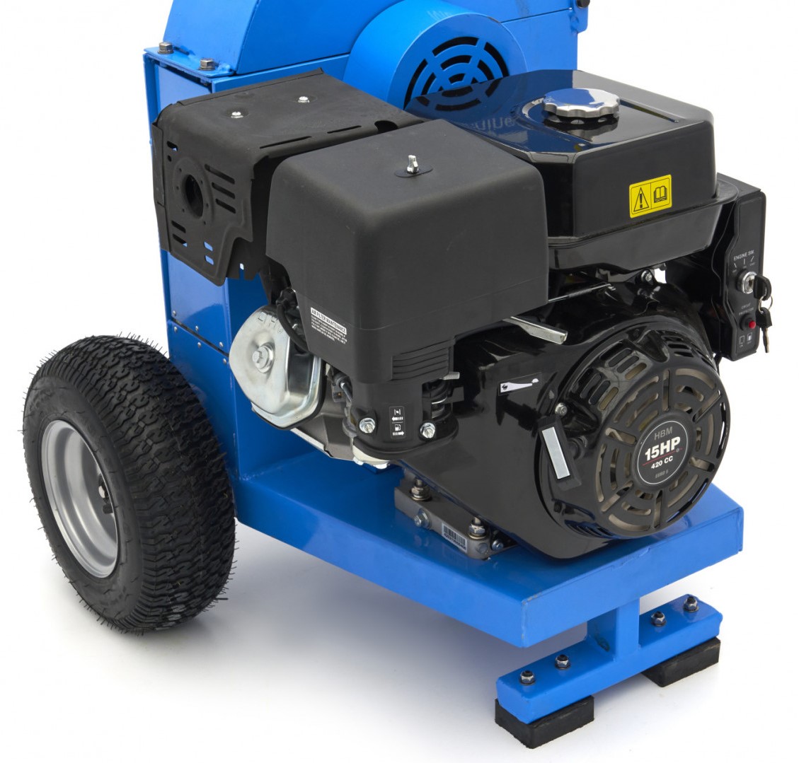 Die Holzhackmaschine verfügt über einen hochwertigen 420-cm³-Verbrennungsmotor, der mit Benzin betrieben wird und seine Ölverteilung nach Befüllung selbst regelt. Das Anlassen des Motors erfolgt elektrisch! Die mitgelieferte 12V Starterbatterie befindet sich in einem soliden Stahlgehäuse, sodass sie für eventuelle Wartungsarbeiten leicht erreichbar ist. Dank der großen, leichtgängigen Räder und dem Einfülltrichter, der gleichzeitig als Griff dient, lässt sich diese Holzhackmaschine leicht bewegen. Am Einfülltrichter ist ein Not-Aus-Taster angebracht, um die Maschine in Gefahrenlage so schnell wie möglich zum Stillstand zu bringen. Auf dem Stahlsockel mit Gummiprofilen steht der Häcksler sehr sicher.