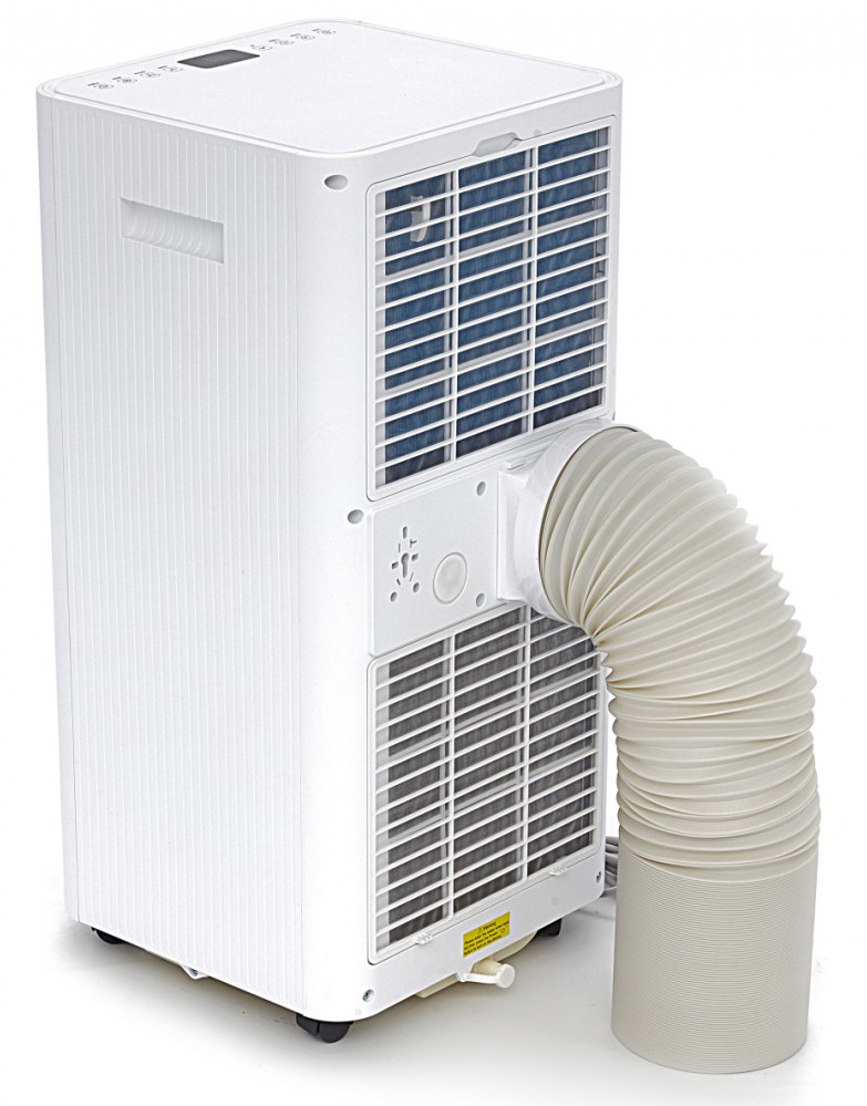 Das Kondenswasser wird in einem Sammelbehälter unter dem Klimagerät gesammelt. Ist dieser Behälter voll, wird dies auf dem Display angezeigt und das Kondenswasser kann über einen Schlauch an der Rückseite abgelassen werden.