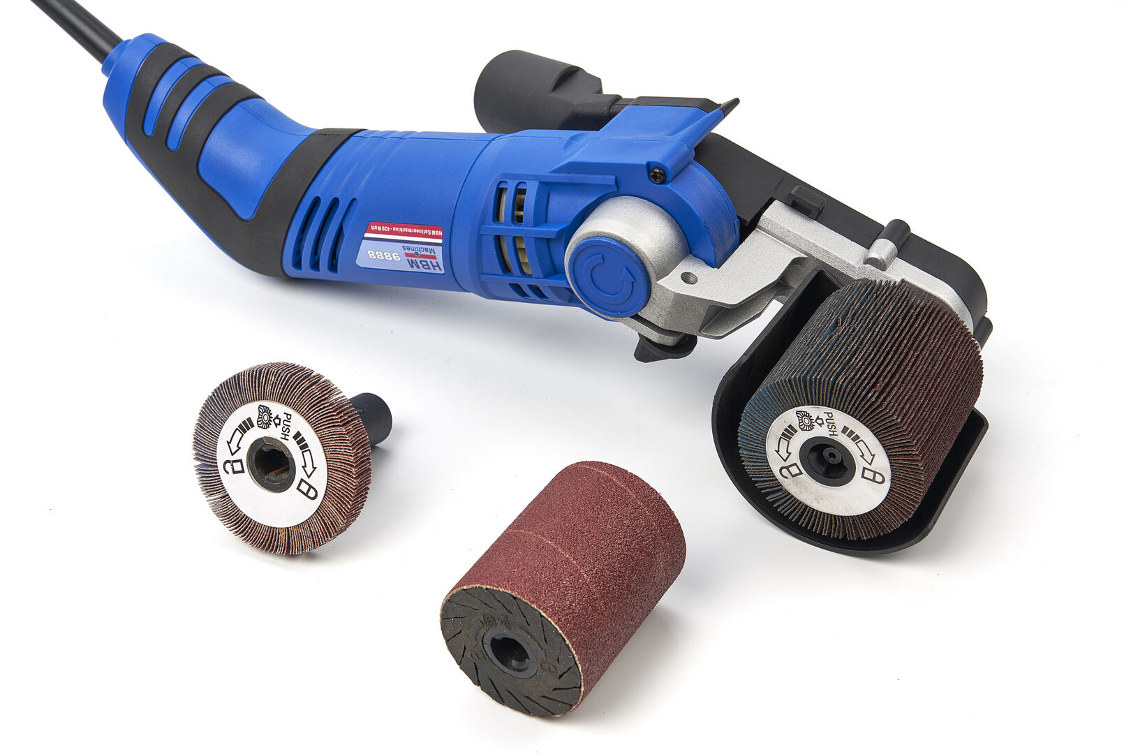 Die Satiniermaschine wird standardmäßig mit einer 60 mm breiten Bürste, einer 10 mm breiten Bürste und einer 60 mm breiten Schleiftrommel geliefert.