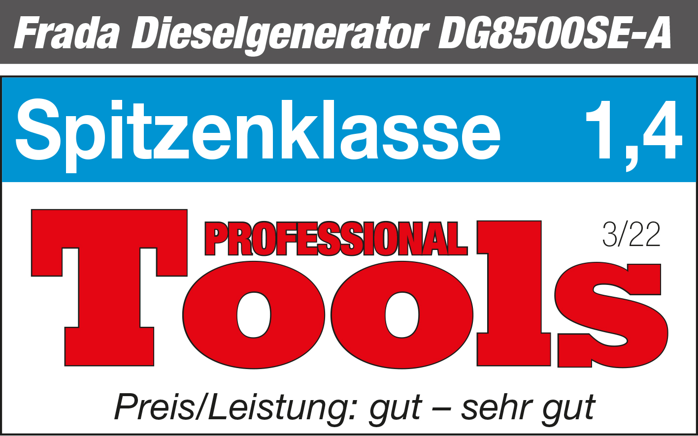 Fazit in der Professional Tools 3/22: "Der Dieselgenerator DG8500SE-A von fradashop ist ein leicht zu bedienender, leistungsstarker Stromgenerator für die Baustelle der sich durch sein Startverhalten, seine Laufeigenschaften und seine Aussstattung auszeichnet. Mit seinem Preis [...] haben wir ihn in die Spitzenklasse eingestuft, hier erreicht er ein Preis-Leistungs-Verhältnis von gut bis sehr gut." |