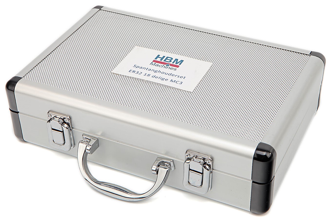 Das Set besteht aus achtzehn Spannzangen, einem Spannzangenfutter und einem Hakenschlüssel. Geliefert werden die Werkzeuge in einem Aufbewahrungskoffer aus Aluminium.