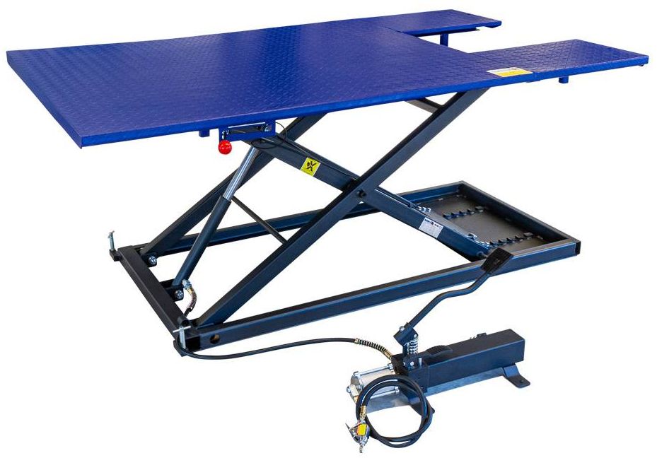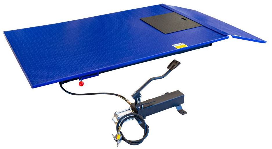 Eine Hebebühne ist ein praktisches Hilfsmittel bei der Durchführung von Arbeiten und Wartungen an Ihrem Fahrzeug. So haben Sie Ihre Arbeit immer im Blick und verringern das Risiko körperlicher Beschwerden. Durch die hydraulische und pneumatische Steuerung können Sie große Fahrzeuge auch anheben, wenn keine Druckluft vorhanden ist. Die Hebebühne ist mit einem hydraulischen Fußpedal zum Anheben, einem hydraulischen Entriegelungspedal und einer pneumatischen Betätigung ausgestattet. Die Verriegelung funktioniert über eine Verzahnung, die mit Hilfe des Hebels entriegelt werden kann. Die Fußpedale und die Auffahrrampe können bei der Arbeit abgenommen werden. Auf der Hebeplattform befindet sich ein abnehmbarer Ausschnitt, um den Ausbau des Hinterrads zu erleichtern.