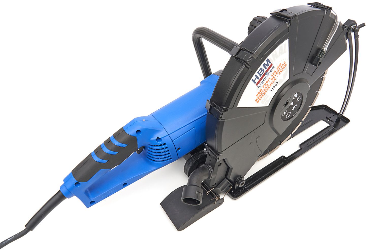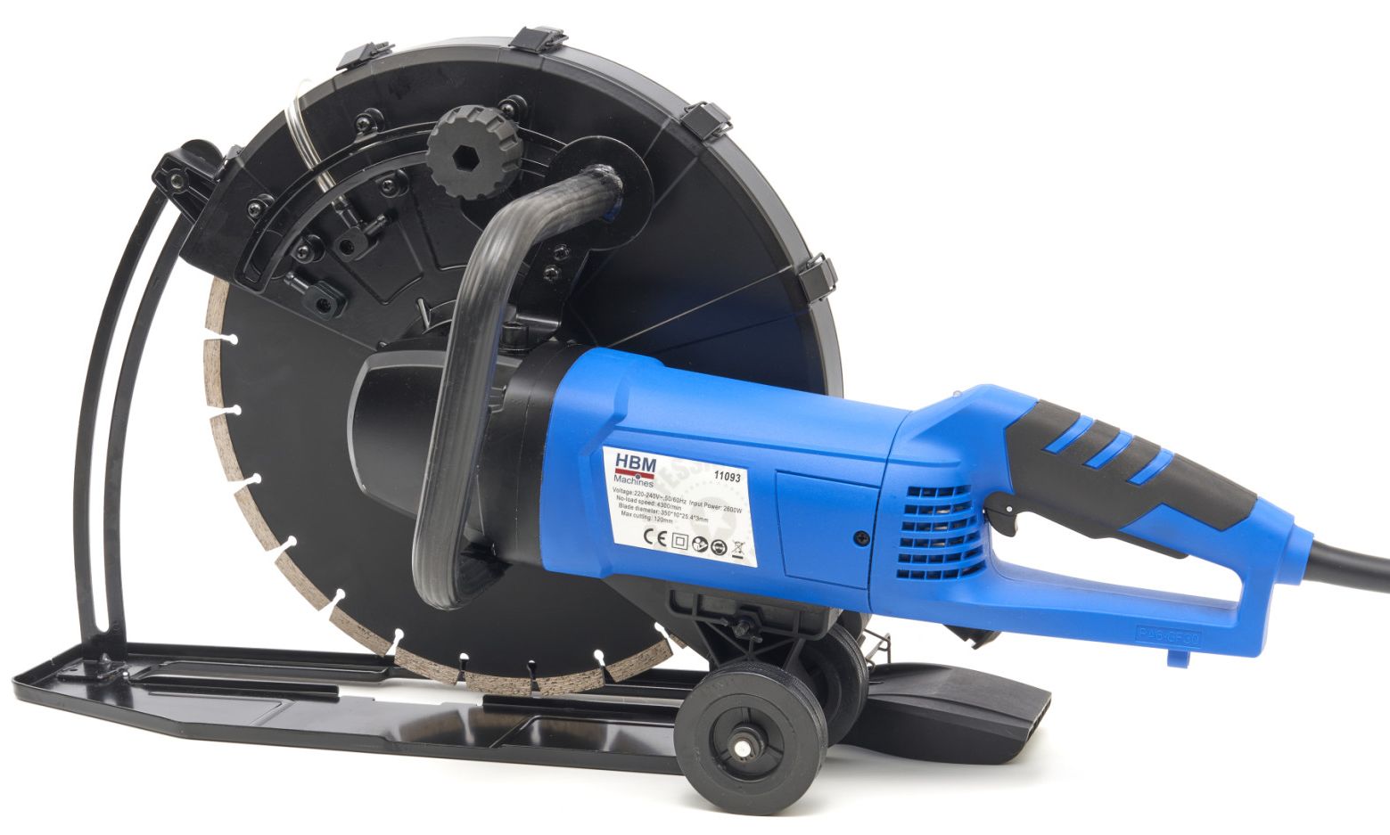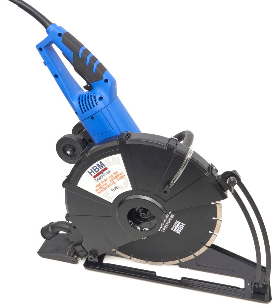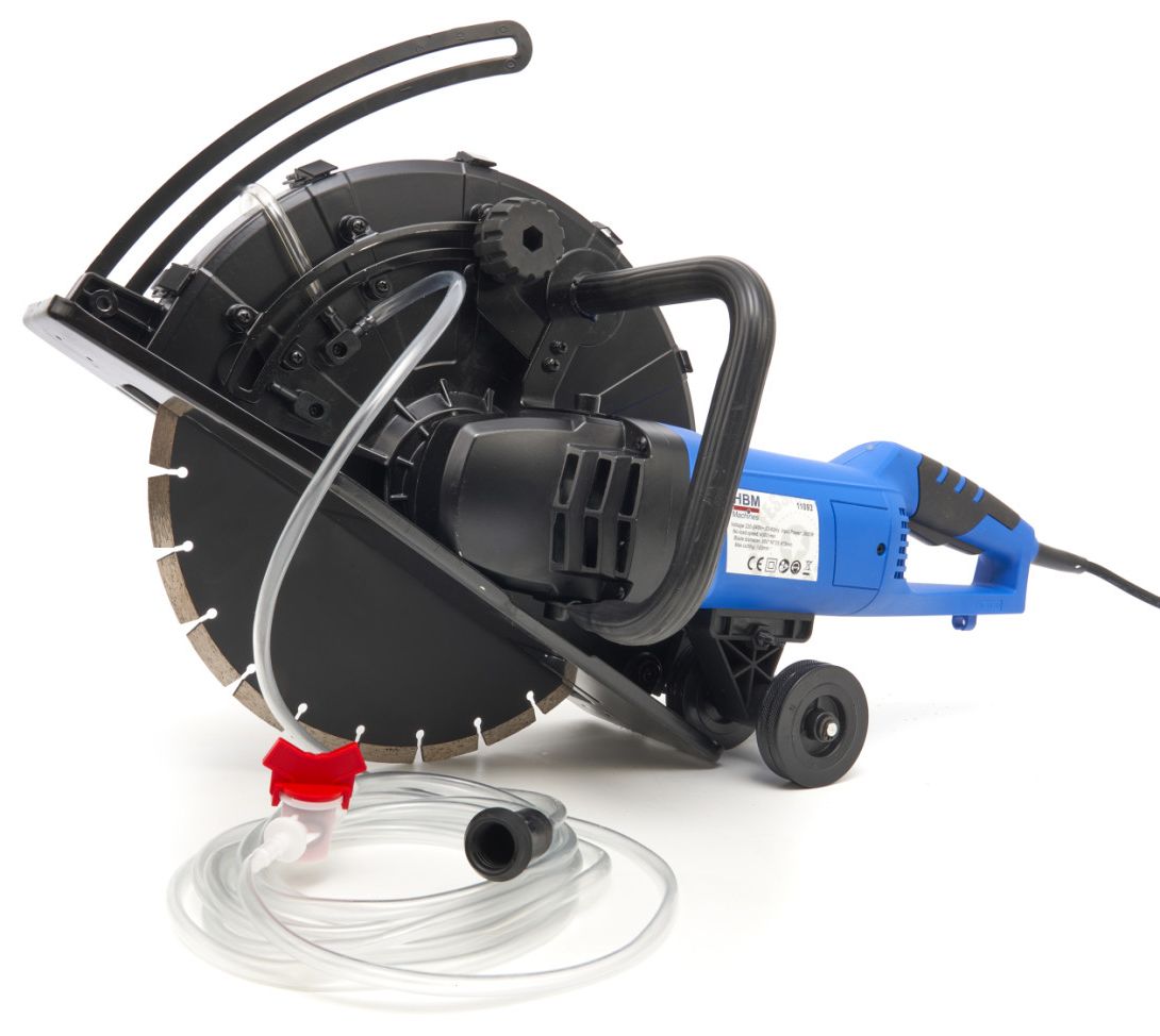 Die Betonsäge arbeitet mit einer Diamanttrennscheibe, die durch den 350mm Durchmesser Schnitttiefen von bis zu 120mm erreicht. So gelangen Sie problemlos durch Ziegel- oder Betonwände! Dabei wird das gut geschützte Sägeblatt auf beiden Seiten durch Wasser gekühlt. Ein PVC-Wasserschlauch mit Gummidüse, der am Wasserhahn angeschlossen wird, liegt der Lieferung bei.