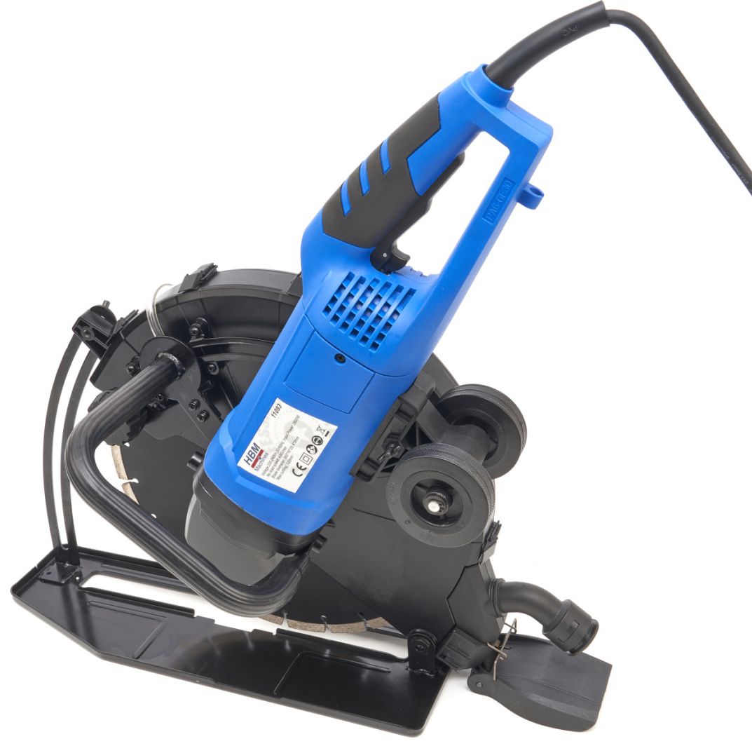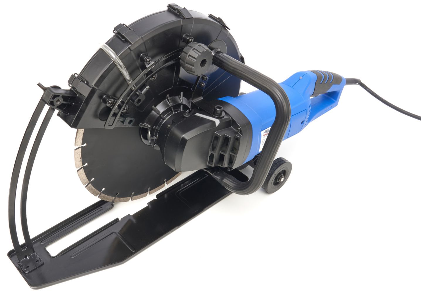 Das Durchtrennen von Wänden erfordert einen starken Motor, weshalb diese Diamantkreissäge mit einem 2600W Motor ausgestattet ist. Sollte der Motor überlastet werden, wird dies durch die im Netzkabel enthaltene Stromüberwachungseinheit signalisiert. Nach einer Überlastungssituation können Sie den Reset-Knopf an dieser Sicherheitseinrichtung drücken, um fortzufahren. Das Motorgehäuse, das mit einem ergonomischen Griff ausgestattet ist, kann gedreht und parallel zur Wand oder im rechten Winkel zur Wand befestigt werden. So können Sie wählen, in welcher Position Sie die Maschine beim Sägen halten wollen. Für die Position parallel zur Wand ist das Motorgehäuse mit zwei abnehmbaren Rädern ausgestattet, die es ermöglichen, die Säge fest an die Wand zu drücken. Dabei kann die Säge trotzdem leicht bewegt werden. Die Position des Motorgehäuses kann unabhängig von der Schnitttiefe eingestellt werden.